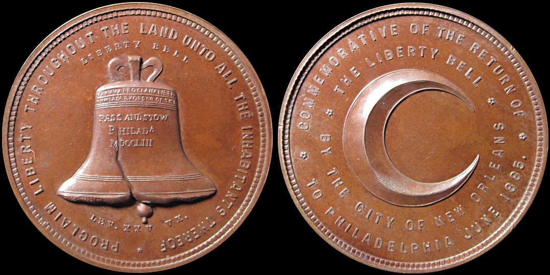 24) From the 1885 Worlds Industrial & Cotton Centennial Exposition held in New Orleans. A strong Very Rare, and Extremely Rare un-holed. I have only seen it in white metal. SH 4-13, White Metal, 45mm. Image courtesy Randy Dobler. |
