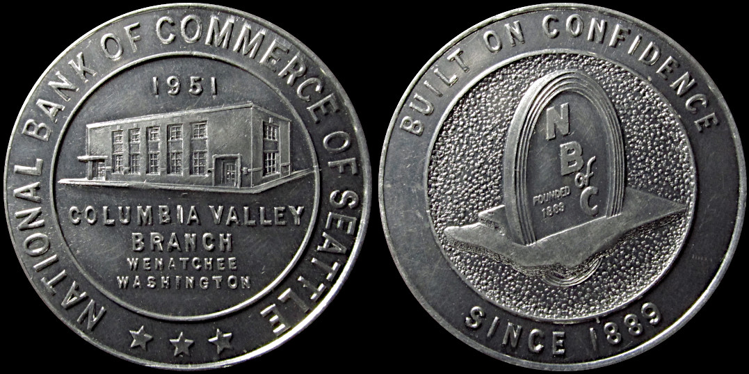 360a) National bank Of Commerce Of Seattle 1951 new branch building at the corner of Orondo Ave and Wenatchee Avenue in Wenatchee, Washington. Rare. Aluminum 38.9mm | |