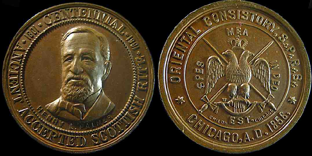 15) Ancient Accepted Scottish Rite / 1801 Centennial 1901 Henry L. Palmer / Oriental Consistory S.P.R.S. / Chicago, A.D. 1856; In small lettering " Childs Chicago" Bronze, 38.6mm