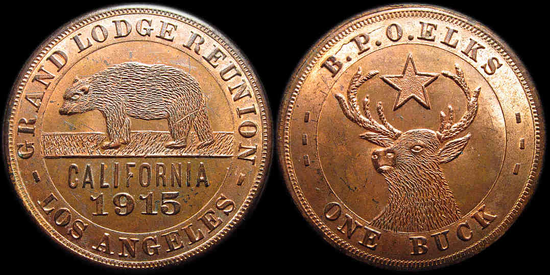 43) Grand Lodge Reunion / Los Angeles / California 1915 / B.P.O. Elks / One Buck. Appears to me to be similar in style to HK-432. Copper, 38.4mm