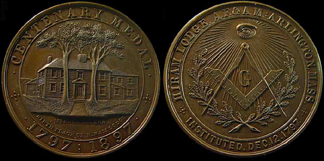 2) Centenary Medal / Munroe Tavern Birthplace of Hiram Lodge / 1797 1897 / Hiram Lodge A.F. & A.M. Arlington, Massachusetts / Instituted Dec 12, 1797; tiny "H.M." initials; Bronze, 40.8mm