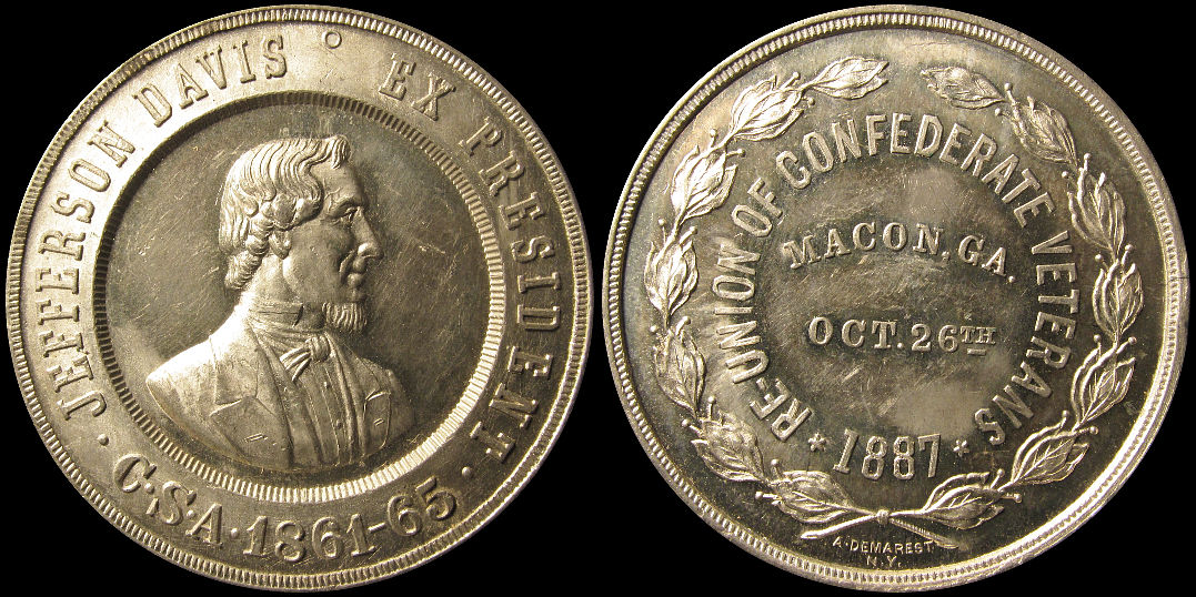 29b) Jefferson Davis Ex President CSA 1861-65 / Re-Union Of Confederate Veterans Macon, Ga. Oct. 26th 1887 / A. Demarest N.Y.; White metal, 38.2mm
