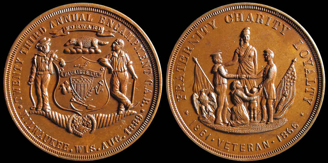 20) Twenty Third Annual Encampment G.A.R. / Milwaukee, Wis. Aug. 1889 / Fraternity Charity Loyalty / 1861 Veteran 1866; Reverse design the same as the Obverse below, and although it does not look like it from my images, this medal is larger in size. Both were most probably minted by William Warner & Brother of Philadelphia. Bronze, 37.6mm