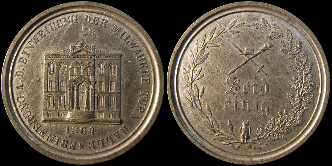 48) In Memory of the 1864 Dedication of the Milwaukee Turn Hall. In 1864 the Turners were not a fraternal organization, but more of a society based on German heritage and physical fitness. On this website I include "Association" and "Commission" commemoratives as main stream so called dollars due to their usual "Public" function, but exclude strictly fraternal medals as shown on this page. A "society" such as this however seems to me to fall somewhere in the middle, but I decided to include it here, at least for now. Today Turner physical fitness centers are open to the general public. White Metal, 41.7mm