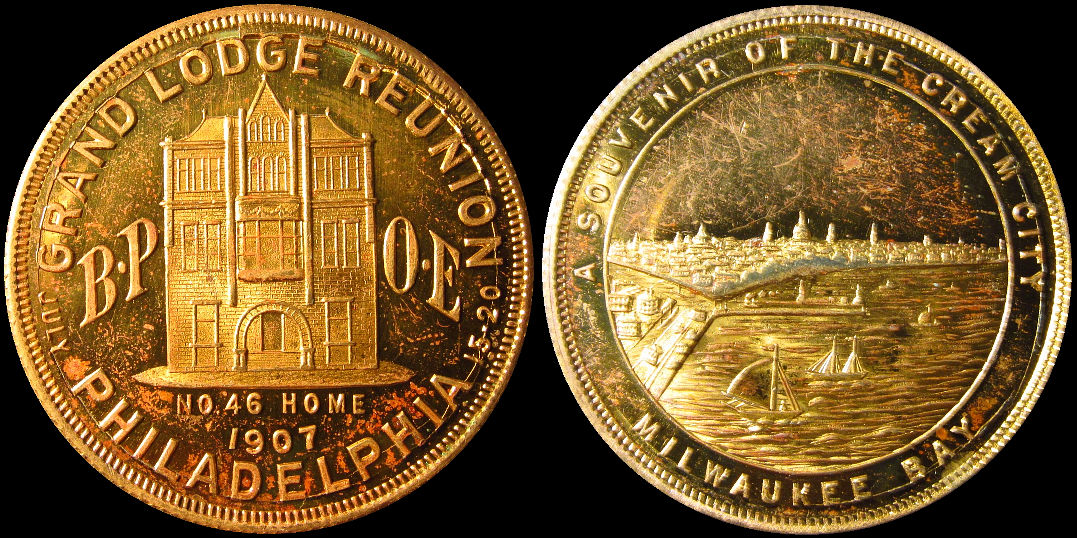 43a) Grand Lodge Reunion No. 46 Home 1907 Philadelphia July Souvenir of the Cream City Milwaukee Bay, Gilt Brass, 36.4mm