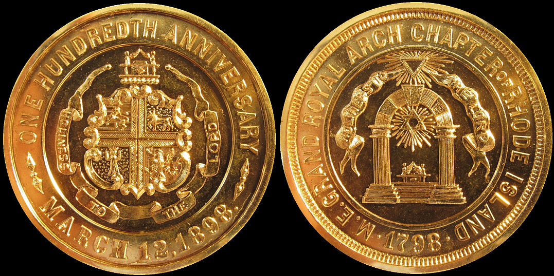 4) One Hundredth Anniversary / March 12, 1898 / M.E. Grand Royal Arch Chapter Of Rhode Island 1798. Engraved on the edge: "M. E. Arthur H. Armington, Grand High Priest." 10 K Gold, probably unique in gold, 33.5mm