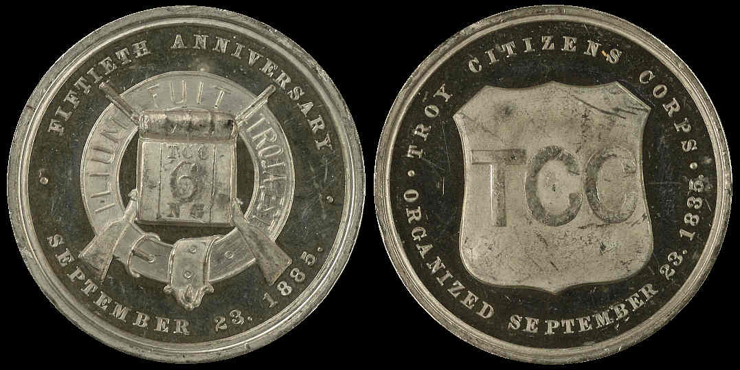 49) Fiftieth Anniversary / September 23, 1885. / Troy Citizens Corps. / Organized September 23, 1885; White Metal, 36mm. Image courtesy of Randy Dobler.