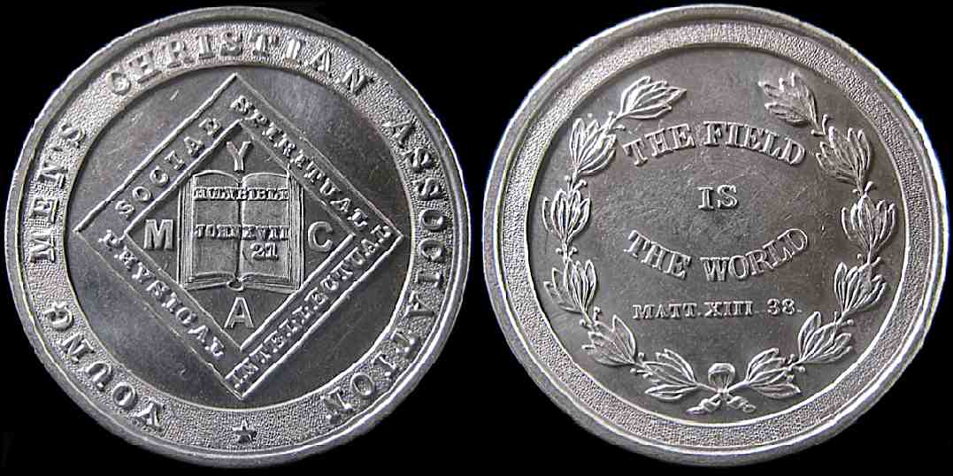 51) Young Men’s Christian Association / YMCA Social Spiritual Intellectual Physical / The Field Is The World Matt. XIII 38; Aluminum, 35.5mm