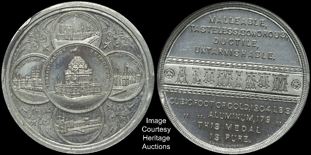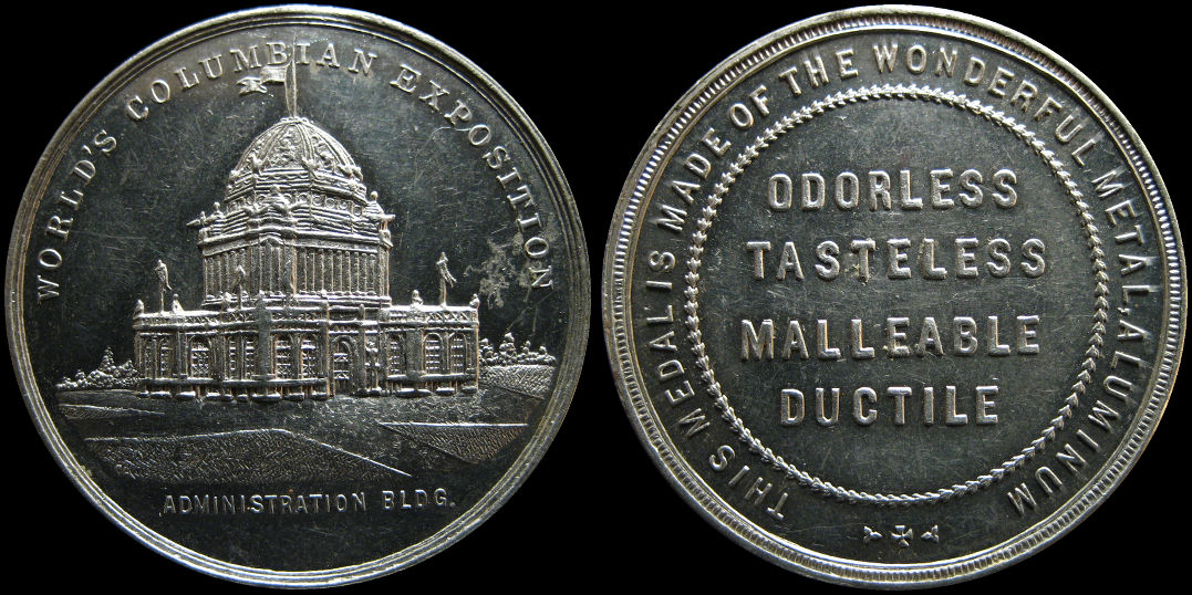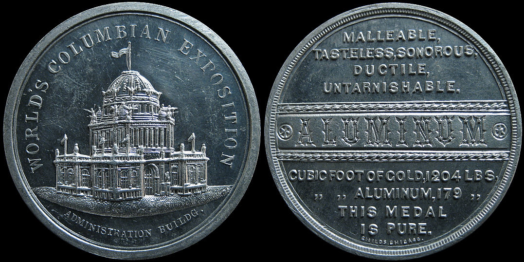 9) Aerial view of fair. The World's Columbian Exposition around above. 1892 below. Rv: Incused ALUMINUM across the middle between two lines. Malleable Tasteless Sonorous Ductile Untarnishable. above in four lines. Cubic Foot Of Gold, 1204 lbs Aluminum 179 This Medal Is Pure below in four lines. Childs, Chicago. around below next to rim in tiny lettering /// Rare, Aluminum / 37.0 mm / SH6-50, HK161, Eglit443 (IMAGE)