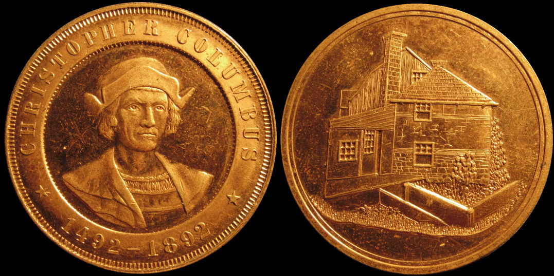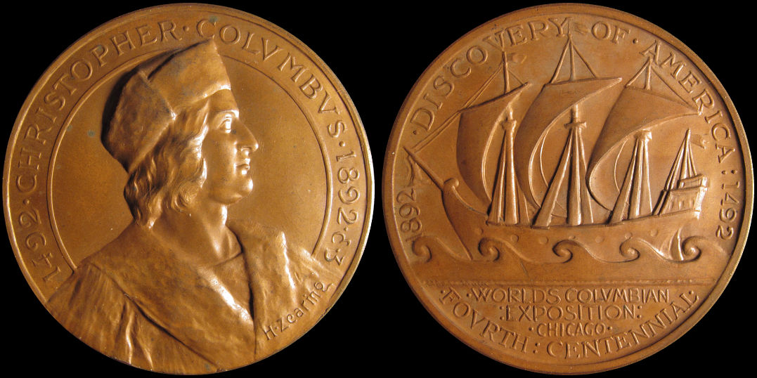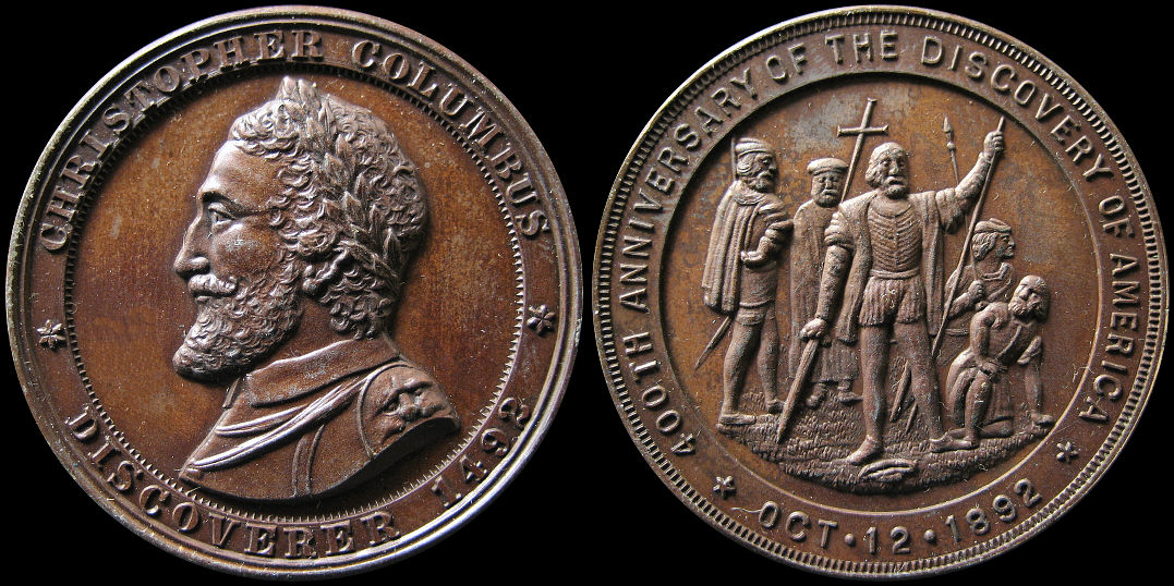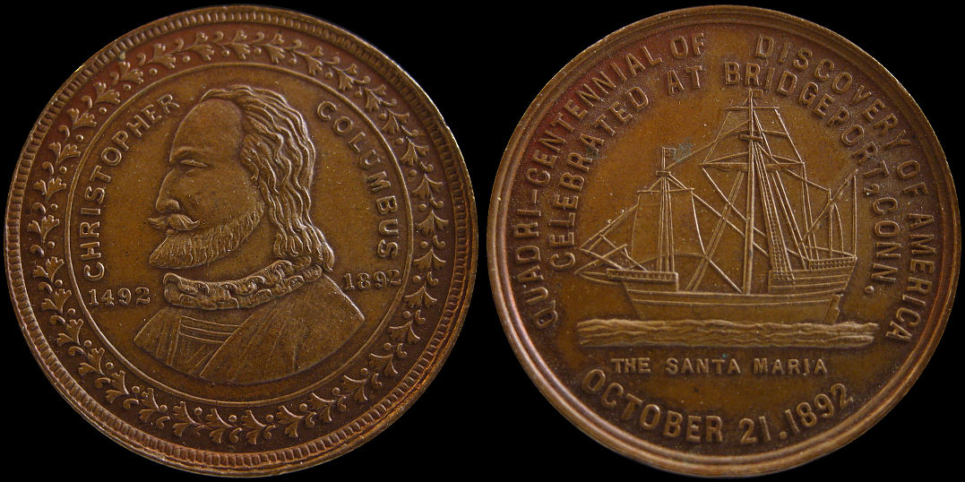 188) Bearded bust left within inner circle. Closed wreath-like border around outside inner circle. Christopher Columbus around to the left and right of bust within inner circle. 1492 1892 to the left and right above shoulders within inner circle. Rv: Sailing ship. Quadri-Centennial Of Discovery Of America Celebrated At Bridgeport, Conn. around above in two arcs. October 21.1892 around below. The Santa Maria below ship. /// Very scarce to rare in Copper Plated Bronze. Rare in White Metal. Have also found described as Silver Plate, Silver, and Auminum, each probably extremely rare. / 38.2 mm (measured) / HK624, HK624a Eglit271 (IMAGE)