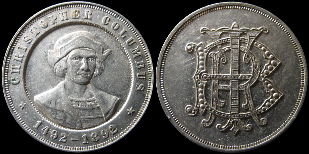 211) Bust slightly right with hat within inner circle. Christopher Columbus around outside above and below. 1892 outside to the left. 1492 outside to the right. Rv: Souvenir October 1892 Columbian Celebration in four curved and straight lines. /// SH6-139. Very rare, Aluminum / 35 mm / Reverse is not in HK. The obverse combines what is inside the inner circle of the obverse of HK227(Columbus portrait) with exactly what is outside of the inner circle of the obverse of HK160. (IMAGE). This piece is also shown on this website HERE with a hanger