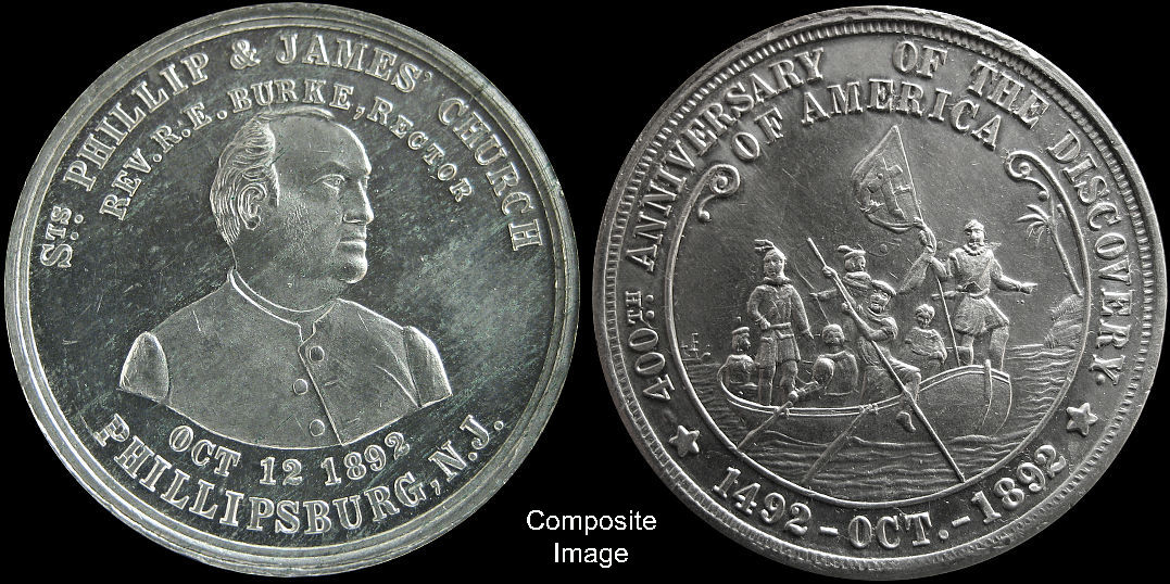189) Man standing on pedestal with globe in his left hand. Columbus around above. Souvenir Medal around below. 1492 around to the left. 1892 around to the right. Rv: Bust 3/4 right. Sts Phillip & James Church Rev. R.E. Burke, Rector around above in two arcs. Oct 12 1892 Phillipsburg, N.J. below in two arcs. /// Scarce in Bronze. Very scarce in White Metal. Rare in Aluminum / 38.3 mm (measured) / HK627, HK628, Eglit309, Eglit309A (IMAGE)