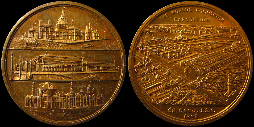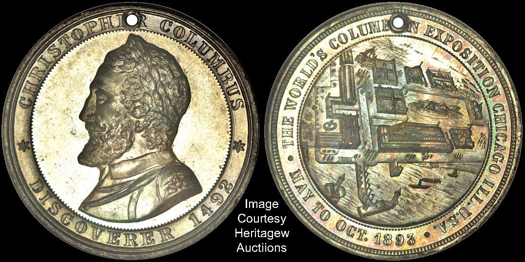 153) Bust left with fur collar. Christopher Columbus 1492 around above. Rv: Birds eye view of fairgrounds within inner circle. The World's Columbian Exposition Chicago Ill. U.S.A. around above. May to Oct. 1893 below. /// Extremely rare in Bronze. Very Rare in White Metal / 38 mm / SH6-105, Eglit333. The obverse has the same portrait as HK232 but with a different legend. Neither side of this piece is pictured in HK. Charles Kirtley October 17, 1992 lot#1659 with picture. (IMAGE)