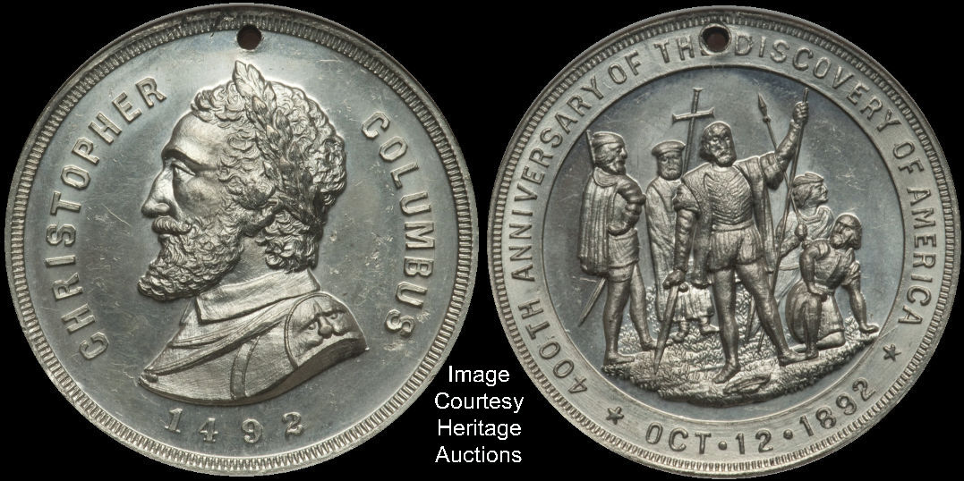 125) Bearded and laureated bust left. Christopher Columbus around to the left and right. 1492 below. Rv: Landing scene with four figures within inner circle. 400th Anniversary Of The Discovery Of America around above. Oct 12 1892 below. /// Very scarce, White Metal / 37.7 mm / SH6-108, HK236, Eglit432 (IMAGE)