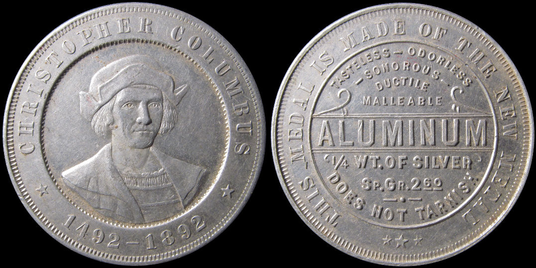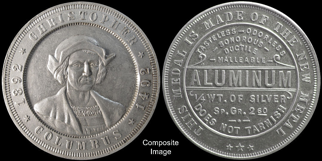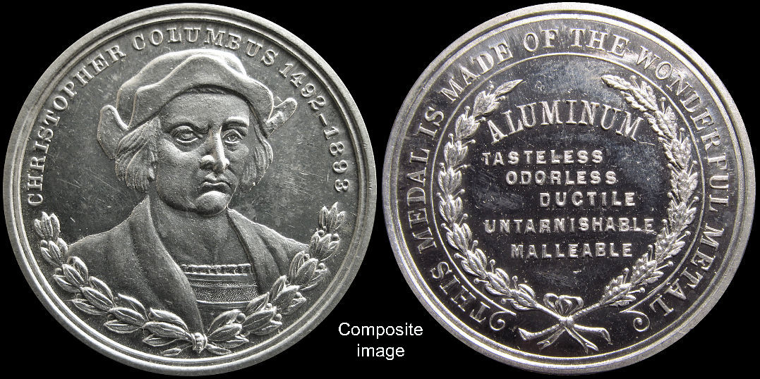8) Bust slightly right with hat within inner circle. Christopher Columbus around above. 1492-1892 below. Rv: Three stars below. This Medal Is Made Of The New Metal around outside. ALUMINUM in the middle between two lines. Tasteless-Odorless-Sonorous-Ductile-Malleable above within inner circle. 1/4 Wt. Of Silver Sp. Gr. 260 Does Not Tarnish below within inner circle. /// Very rare die pairing / Aluminum / 35 mm / Obverse HK227 combined with the reverse of HK160. SH6-138 (IMAGE)