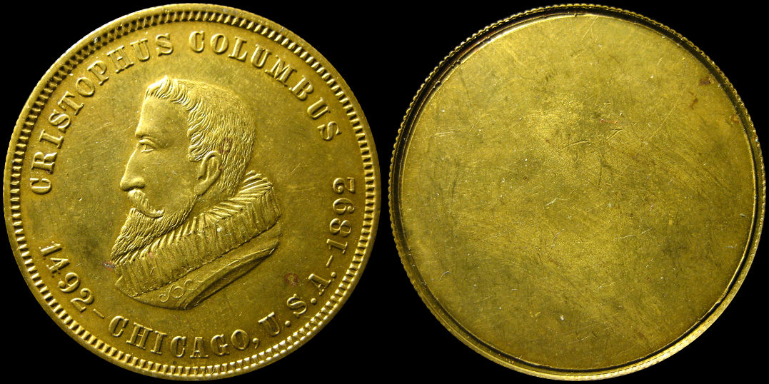 133) Bust left with beard and ruffled high collar. Cristophus Columbus around above. 1492-Chicago, U.S.A.-1892 around below. Rv: Blank. /// Rare / Brass / 34.4 mm (measured) / SH6-82, HK237e (IMAGE)