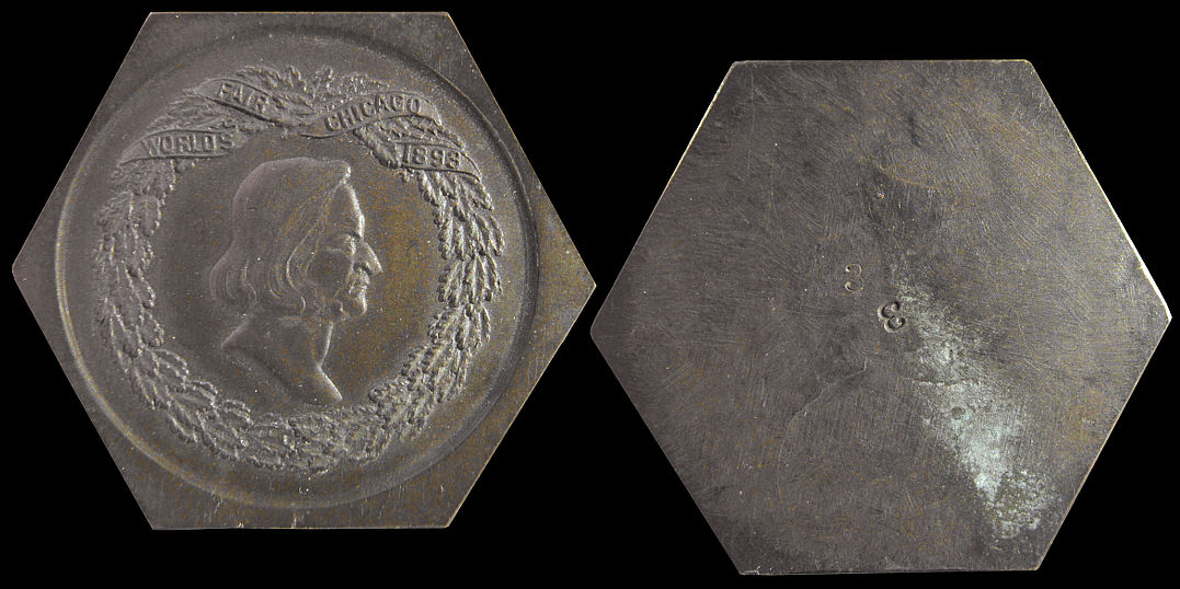 135) Bust right within thick closed outer wreath. Worlds Fair Chicago 1893 within ribbon on wreath above. Rv: Blank. Hexagonal. /// Brass, Lead, Bronze, and possibly White Metal. Very to extremely rare in Brass or Lead. Extremely rare in Bronze or White Metal? / 34 mm / SH6-163, K237a, HK237b, Eglit66? but reference to 63, 63A, and 63B in Eglit must be in error. (IMAGE courtesy Bill Walter)