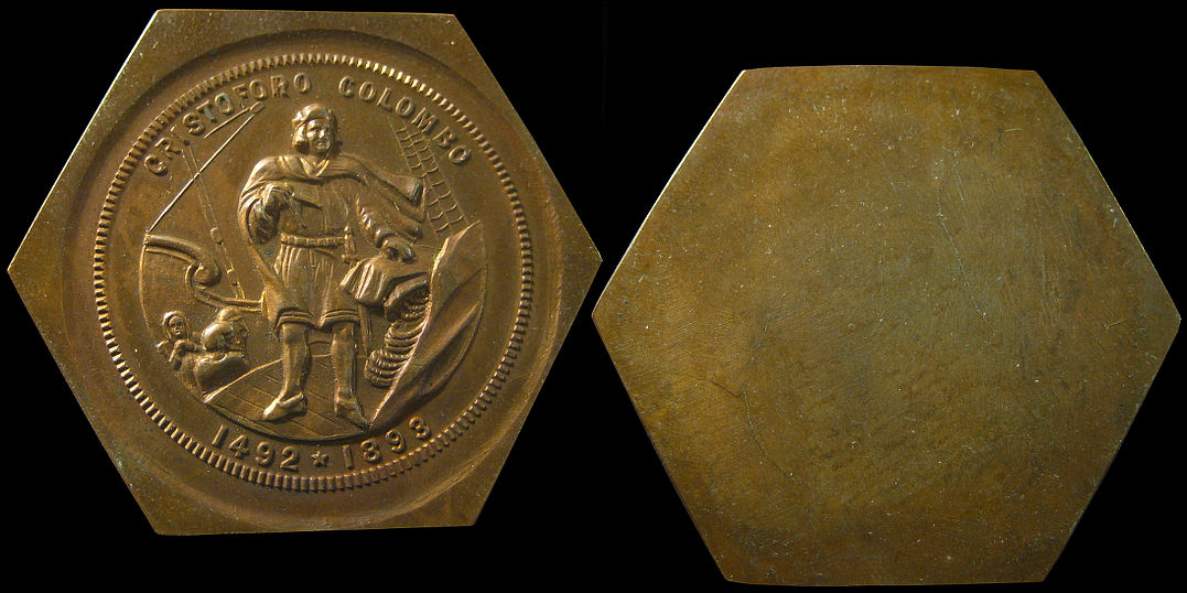 136) Standing male figure on board a ship. Cristoforo Colombo around above. 1492 1892 below. Rv: Blank. Hexagonal. /// Lead, Copper, or Brass. Very to extremely rare in all metals. There are also a few rare Lead die trials that are not hexagonal / 44.3 mm / SH6-164, HK237c, 237d(IMAGE)
