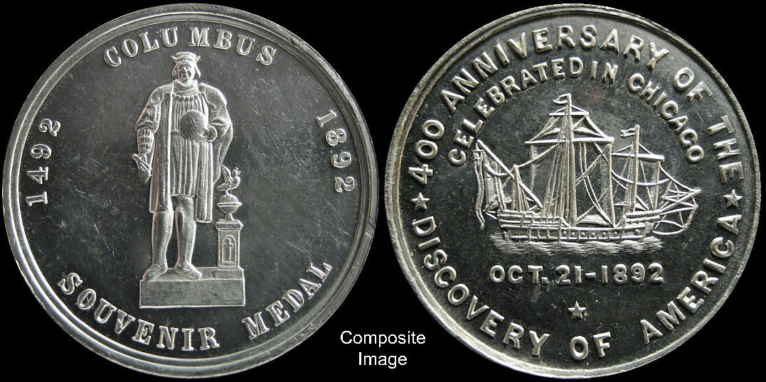 137) Man on pedestal holding globe in his left hand. 1492 Columbus 1892 around above. Souvenir Medal around below. Rv: Sailing ship. 400th Anniversary Of The Discovery Of America around above and below. Celebrated In Chicago above. Oct. 21-1892 below ship. /// Very scarce in Bronze. Very scarce to rare in White Metal. Very rare, maybe extremely rare in Aluminum / 38.3 mm / SH6-117, HK238, Eglit189 (IMAGE)