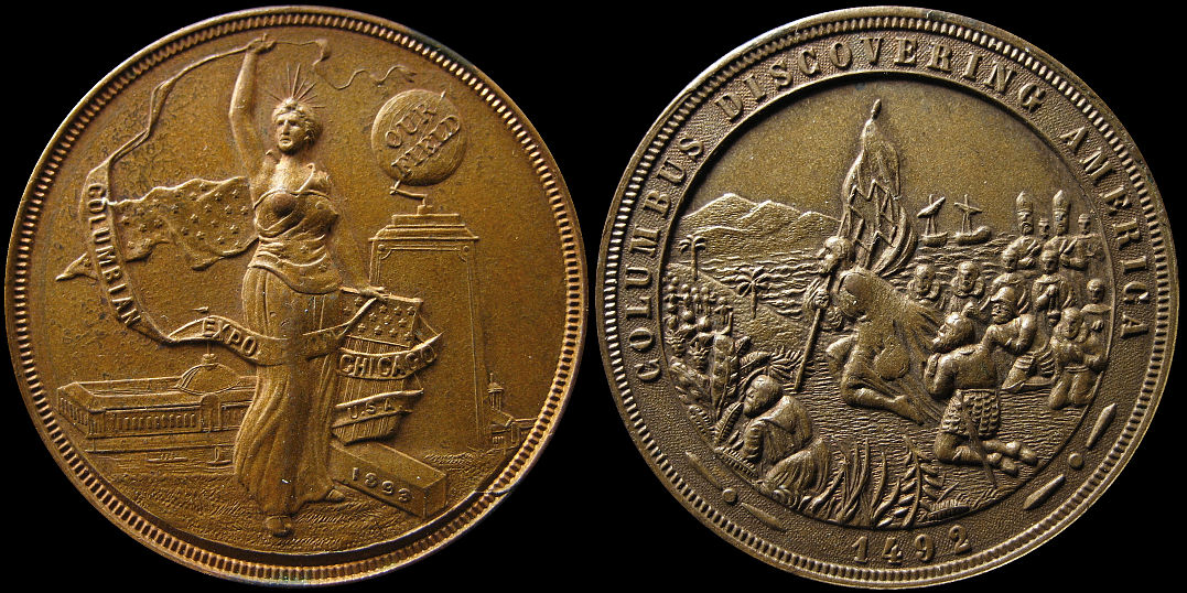 94) Liberty head left in low relief. Stars around in outer circle. Beaded outer border next to rim. 1892 below. Small W.M. below bust. Rv: Columbus landing scene with multiple figures. Dedicated To The American People In Honor Of The 400th Anniversary Of The Discovery Of America around above. United We Stand Divided We Fall below. 1492 inside inner circle below. /// Rare in Aluminum. Unlike the high relief version, the low relief version is quite hard to find in anything but aluminum. My linked image here is an example in brass. Besides the bronze low relief entry in HK, it may also exist in gilt, silver, and silver plate. / 35.8 mm / SH6-80, HK220a, HK222a (IMAGE)