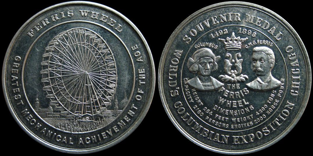 40) Building with dome. Worlds Columbian Exposition around above. Administration Building below in an arc. Rv: Ferris wheel. Greatest Mechanical Achievement Of The Age around above. Height 264 Feet Weight 4300 Tons Capacity 2160 People Engines 2000 Horsepower below in two curved lines. Ferris Wheel on ribbon above ferris wheel. /// Common, Aluminum / 44.7 mm (measured) / SH6-17, HK170, Eglit157 (IMAGE)