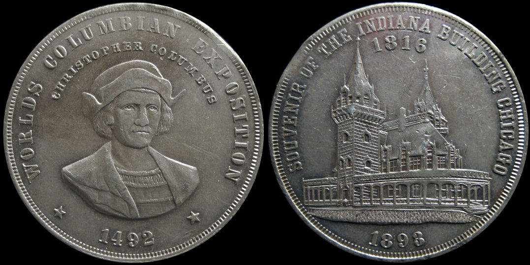 147) Bust of Columbus slightly right with hat. Worlds Columbian Exposition around above. Christopher Columbus in smaller print around above bust. 1492 below. Rv: Building. Souvenir Of The Indiana Building Chicago around above. 1816 above. 1893 below. /// Very scarce, maybe Rare, White metal / 37.0 mm / SH6-59, Eglit11. Eglit describes this piece as being 32mm which is in error (IMAGE)