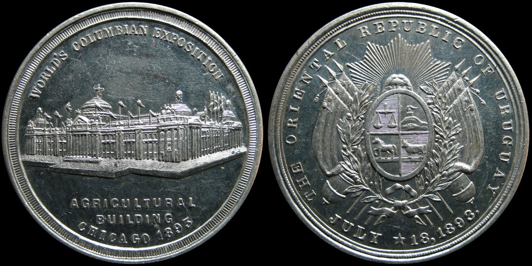 149) Building. World's Columbian Exposition above in an arc. Agricultural Building Chicago 1893 below in three lines. Rv: Coat of arms. The Oriental Republic Of Uruguay around. July 18, 1893. with star star between JULY and 18. /// Included with the variety above, Rare to Very rare. I do not know which variety is rarer, Aluminum / 37.2 mm / Varieties with or without date - look above. SH6-77.1 (IMAGE)