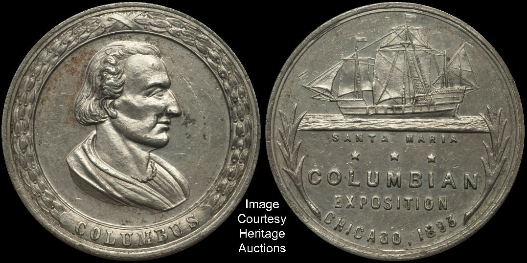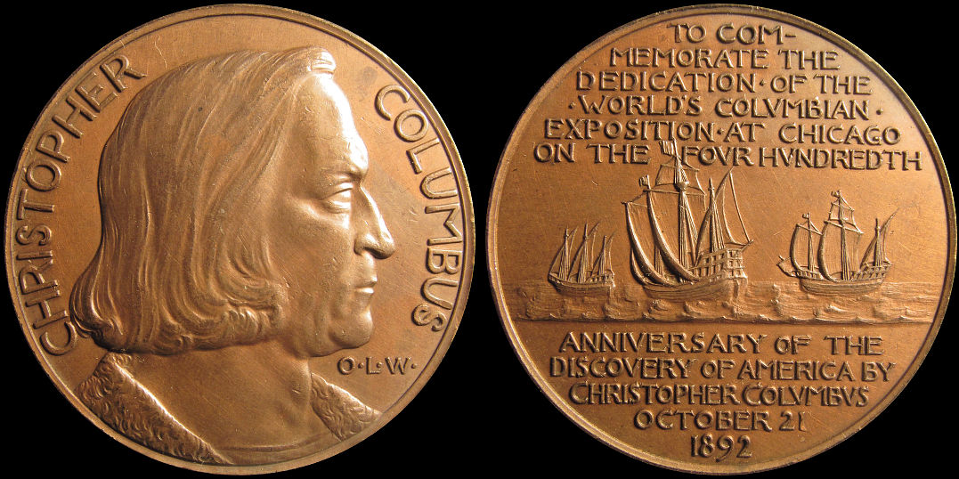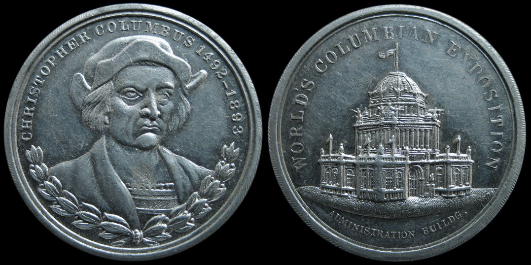 154) Bust right. Christopher Columbus around to the left and right. O.L.W. under chin, Rv: Three ships. To Commemorate the Dedication of the World's Columbian Exposition at Chicago On The Four Hundredth Anniversary Of The Discovery Of America By Christopher Columbus October 21 1892 above and below ships in eleven lines. /// Found in multiple metals: silver, white metal, bronze, nickel, aluminum, lead, and silver plate, with lead and nickel perhaps being the rarest, and the most common possibly being bronze, with the majority in bronze being looped and often with attached ribbon hanger. The American Numismatic Society in New York has a number of these on their web site in various metals with pictures. / 34.9 mm / SH6-158, Eglit334 and Eglit406 with picture. (IMAGE without any evidence of a loop)