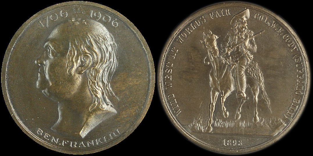 165) Bust left. 1706-1906 above. Ben. Franklin below. Rv: Man on horse with rifle. Wild West At Worlds Fair Col. W.F. Cody (Buffalo Bill) around above. "1893" below in exergue. /// Issued for the 1906 Benjamin Franklin bicentennial using a reverse die that was used during the 1893 Worlds Columbian Expo. Very rare in Copper or Silver Plated Copper / 38 mm / Eglit 361 with picture (IMAGE courtesy Randy Dobler)