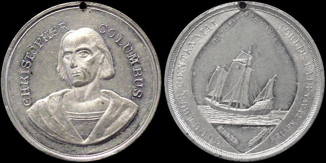 167) Bust of Columbus slightly left. Christopher Columbus around to the left and right. Rv: Ship sailing left within a curved diamond shaped border. Columbus Centennial Worlds Fair Naval Review around to the left and right. Flag Ship Of Columbus in small lettering above. Maria Santa below. /// Rare, Aluminum / 40 mm / SH6-119, Eglit195. I have never run across one of these unholed. Charles Kirtley sale #89 lot#1047 with small picture of reverse with hanger. (IMAGE courtesy Bill Walter)