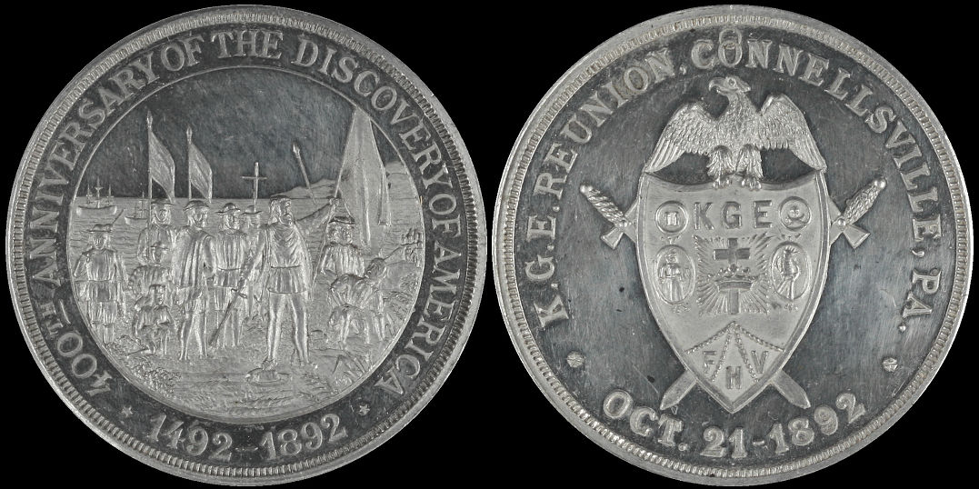 177) Columbus landing scene within center circle. 400th Anniversary Of The Discovery Of America 1492-1892 around. Rv: Spread eagle atop shield. K.G.E. Reunion, Connellsville, Pa. Oct. 21-1892 around above and below. /// Very rare, Aluminum / 38 mm / Charles Kirtley sale #11 lot#763 for picture.(IMAGE courtesy Randy Dobler)