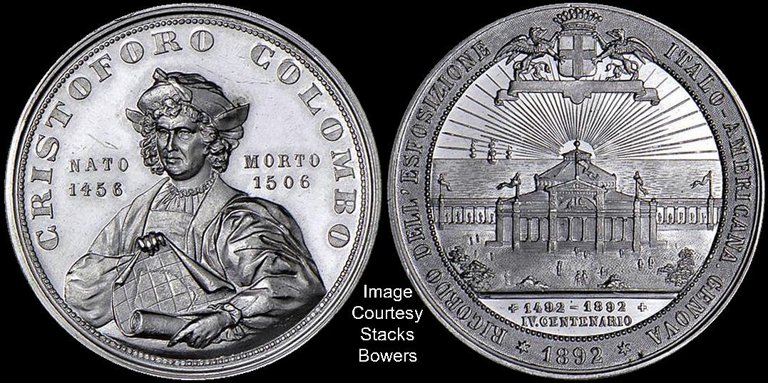 180) Half length bust of Columbus quarter left unrolling chart. Christoforo Colombo around. Nato 1456 to the left. Morto 1506 to the right. RV: Exposition building with rising sun in the distance within inner circle. Three small ships to the left in the distance. Ricordo Dell'Esposizione Italo-America. Genova 1892 around outside. 1492-1892 IV Centenario in exergue in two lines /// Rare in Aluminum. Extremely rare in Bronze / 36 mm / Eglit427 with picture. (IMAGE)