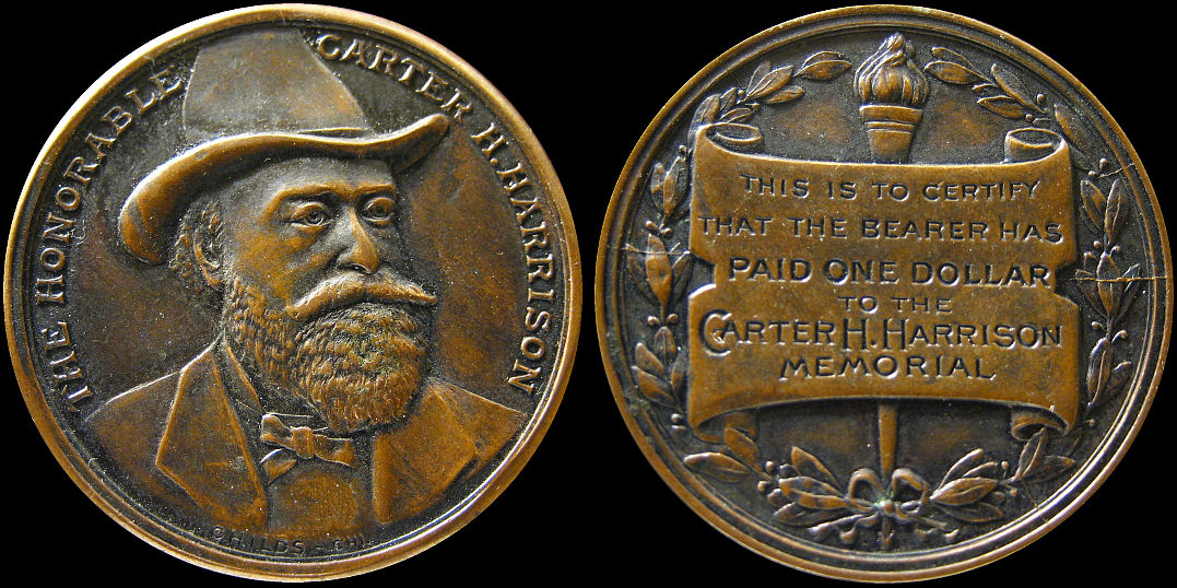 185) Male bust partial right wearing hat. The Honorable Carter H. Harrison around to the left and right of hat. Childs, Chi. in tiny lettering below. Rv: Torch in back of plaque surrounded by open wreath. This Is To Certify That The Bearer Has Paid One Dollar To The Carter H. Harrison Memorial in six lines on plaque. /// Scarce, Copper / 38.6 mm / SH6-9, HK765, Eglit360, Rulau Chi 78 (IMAGE)