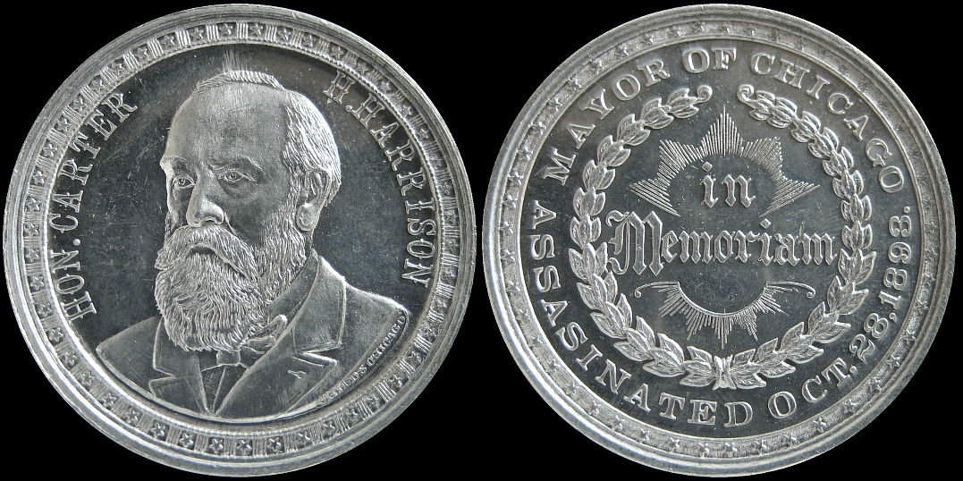 186) Open wreath. Outer border of small stars. Mayor Of Chicago around above outside. Assasinated Oct. 28, 1893. around below outside. In Memoriam within wreath. Rv: Bearded bust 3/4 left within inner circle. Outer border of small stars. Hon. Carter H. Harrison around to the left and right of bust within inner circle. Childs Chicago in tiny lettering below bust to the right. /// Rare, Aluminum / 38.4 mm (measured) / SH6-8, HK766, Eglit359 (IMAGE)