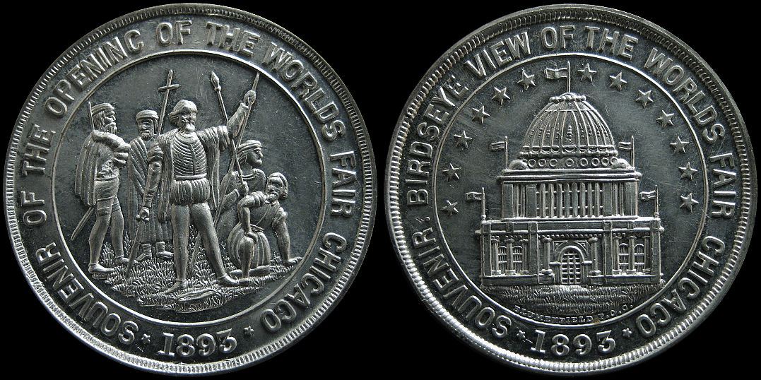 19) Domed building within inner circle. Twelve stars around above building. Souvenir. Birdseye View Of The Worlds Fair Chicago around outside. 1893 below. Blumenfield P.O.C. around below in tiny lettering within inner circle Rv: Landing scene with five figures. Souvenir Of The Opening Of The Worlds Fair Chicago around outside. 1893 below. /// Common in Aluminum, scarce in White Metal / 39.7 mm / SH6-32, HK165, HK166, Eglit21 (IMAGE)
