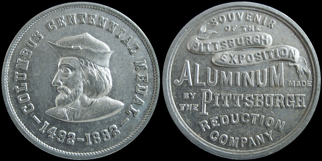190) Souvenir Of The Pittsburgh Exposition Aluminum Made By The Pittsburgh Reduction Company with PITTSBURGH EXPOSITION on banners. Rv: Bearded bust left with hat. Columbus Centennial Medal around and above. 1492-1892 around below. /// Rare, Aluminum / 37.9 mm (measured) / SH5-121, HK629, Eglit571, Rulau Pit 32 (IMAGE)