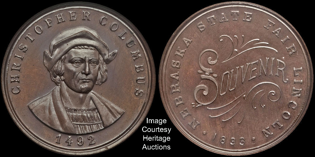 191) Hatted bust of Columbus slightly right. Christopher Columbus around above. 1492 below. Rv: Nebraska State Fair Lincoln around and above. 1893 below. Souvenir across in large ornamental lettering. /// White metal-rare; Very rare, maybe extremely rare, Bronze / 38 mm / HK632, HK632a Eglit69 (IMAGE)
