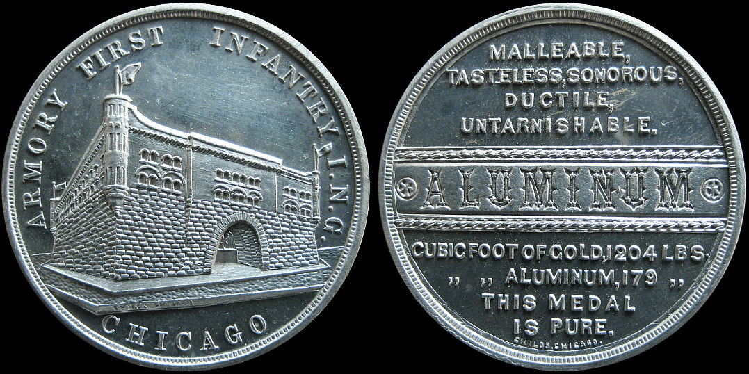 192) Building with arched entrance. Armory First Infantry I.N.G. above around. Chicago below. Rv: Incused ALUMINUM across the middle between two lines. Malleable Tasteless Sonorous Ductile Untarnishable. above in four lines. Cubic Foot Of Gold, 1204 lbs Aluminum 179 This Medal Is Pure below in four lines. Childs, Chicago. around below next to rim in tiny lettering. /// It was at this armory that a reception ball took place as part of dedication ceremonies for the World’s Fair. It included 15,000 guests including the President and Vice president. / SH6-51. Rare, Aluminum / 37.0 mm / Same reverse as HK161. (IMAGE). For the building dedication reverse variety of this piece, search within the so called dollar"Search Page" on this website