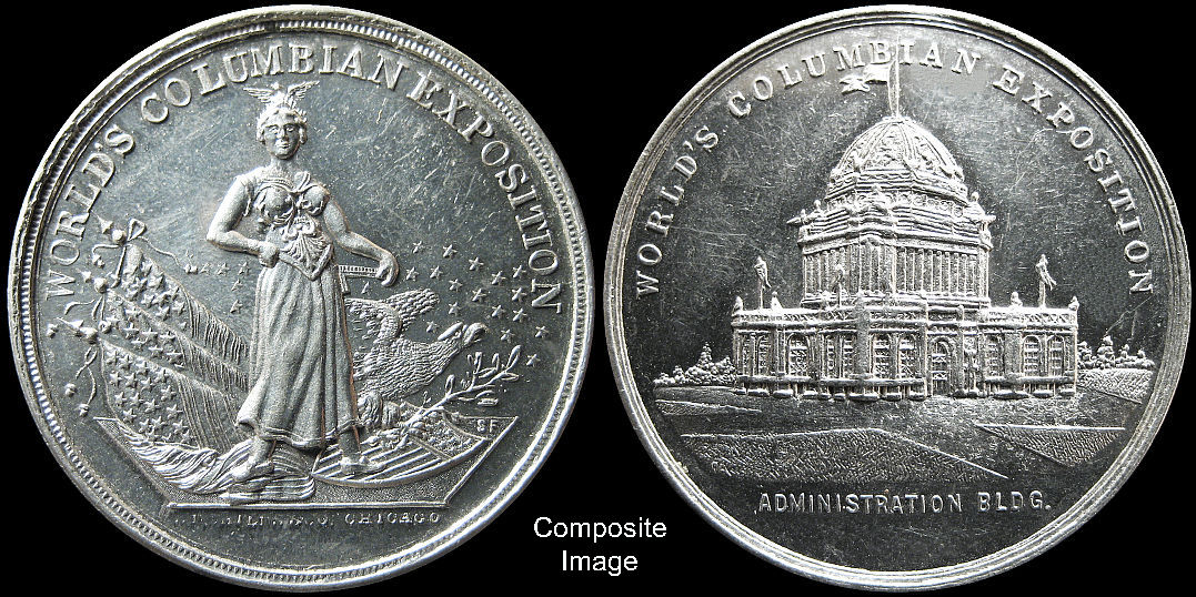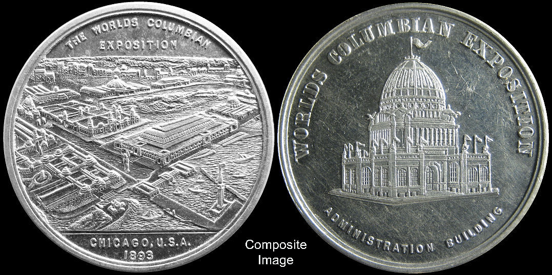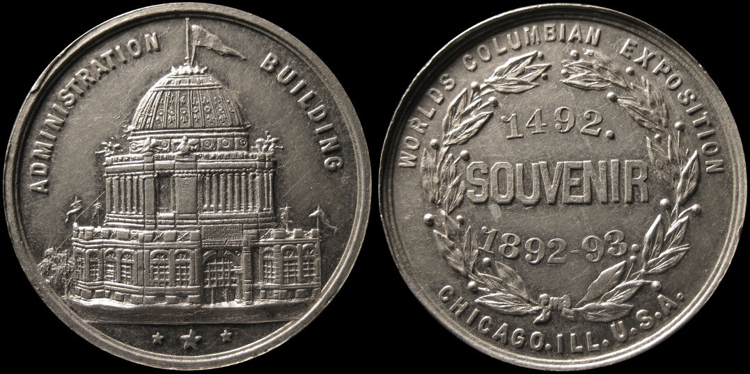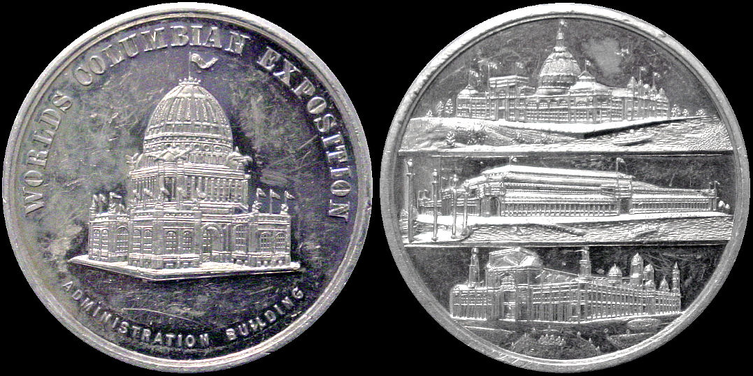 49) Columbus facing left within open wreath. The World's Columbian Exposition around above. Chicago 1893 below. Rv: Building with dome. The Administration Building below. 260 Feet Square Cost $450,000 below in small print. / Very scarce in Brass and Aluminum with Brass being slightly more common. Rare in Silver Plate. Extremely rare in Copper if in fact it exists at all. Be careful of worn pieces described as Bronze or Copper that could in fact be Brass. / 35.6 mm with all probably having a reeded edge / SH6-83, HK176, HK177, Eglit118 (IMAGE)