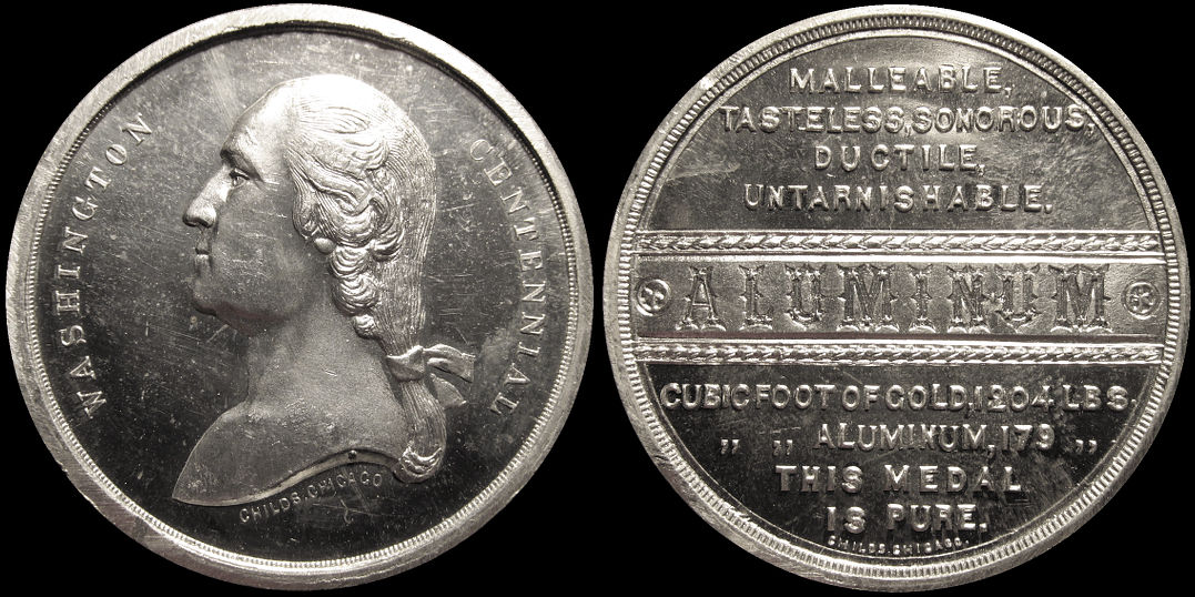205) Washington bust left. Washington Centennial around. Childs Chicago below bust in tiny lettering. Rv: Incused ALUMINUM across the middle between two lines. Malleable Tasteless Sonorous Ductile Untarnishable. above in four lines. Cubic Foot Of Gold, 1204 lbs Aluminum 179 This Medal Is Pure below in four lines. Childs, Chicago. around below next to rim in tiny lettering. (IMAGE)