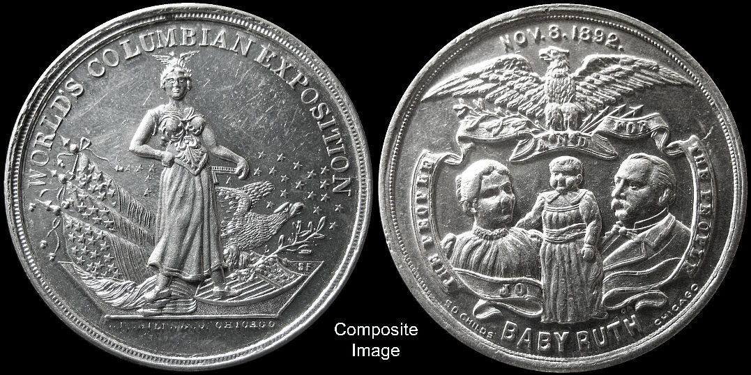 140) Two busts on either side of baby Ruth. Eagle above. Nov. 8, 1892. above. Of The People And For The People on streamers. Baby Ruth below. S.D. Childs Chicago in tiny lettering next to rim split to the left and right. Rv: Three small busts. The Worlds Columbian around above. Souvenir below. Americas Trinity of Heroes below. 1776, 1860 and 1865 below the three busts. /// Scarce, White metal / 38.2 mm / SH6-25, HK241, Eglit80, Eglit80a (IMAGE)