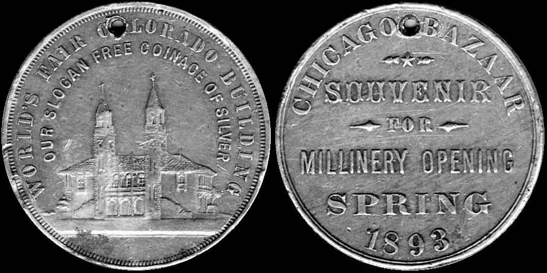 212) Building with two spires. World's Fair Colorado Building around above outside. Our Slogan Free Coinage of Silver around above inside. Rv: Chicago Bazaar Souvenir For Millinery Opening Spring 1893 in six curved and straight lines. /// Extremely Rare, Aluminum, 38mm. Same obverse as the reverse of HK210. Is found un-holed. (IMAGE courtesy John Dean)