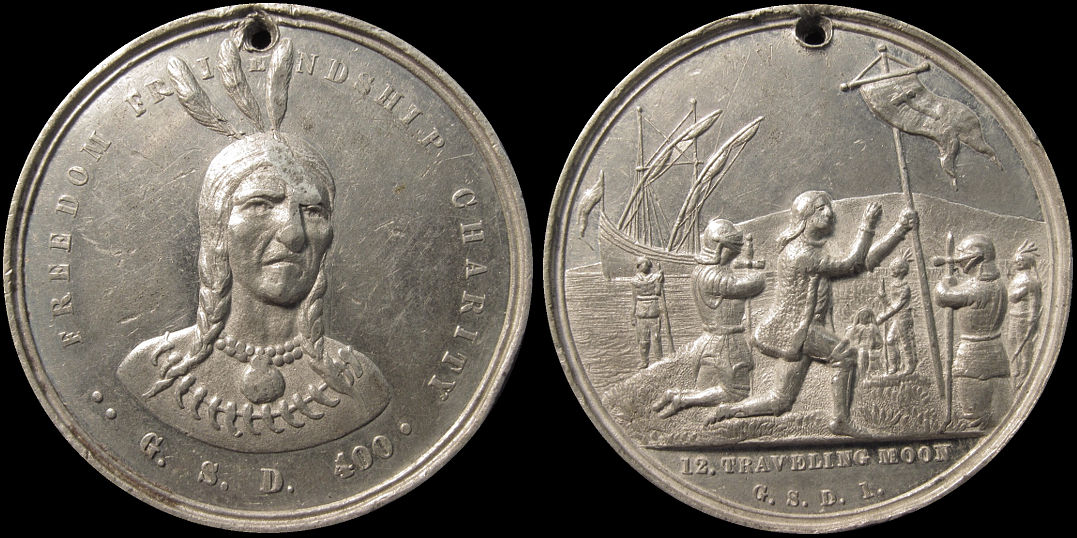 219) American Indian bust slightly right. Freedom Friendship Charity G.S.D. 400 around. Rv: Landing scene with kneeling men and ship off to the left. 12. Traveling Moon G.S.D.1. below in two lines /// Found in bronze and white metal. Extremely rare either way, White metal / 37.9mm. Combines a fraternal obverse die(Improved Order of Red Men) with a Columbus landing scene reverse that is sometimes found combined with the obverse of HK224, but with a different inscription. (IMAGE)