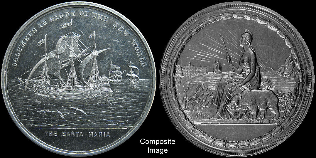 22) Sailing ship with two smaller ships to the right. Columbus In Sight Of The New World around above. The Santa Maria below in exergue. Hanson in microscopic lettering at bottom left base of sea scene. Rv: California seal with female figure seated with staff in right hand and bear at her side. Sun to the right. Wreath-like outer border. Hanson Chi. at base in tiny lettering. /// Extremely rare, Brass / 38 mm / Rare die pairing from two different fairs. Reverse of HK167 and the reverse of HK249. Charles Kirtley October 14, 1989 sale lot #146 with picture. SH7-34 (IMAGE)