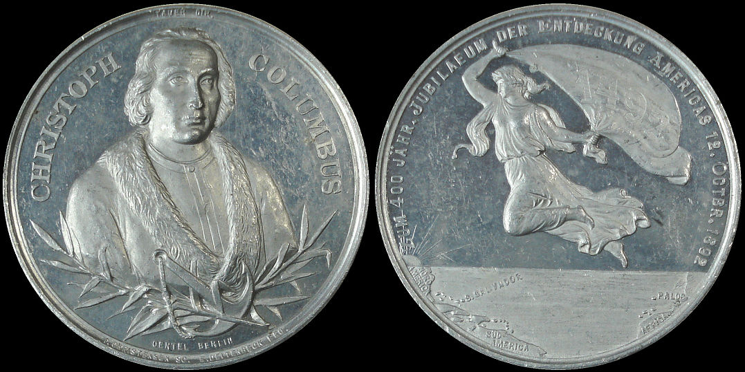 216) World globe. Sum 400 Jahr. Gedenktage Der Entdeckung Von America around outside. 1892 below. Rv: Elaborate landing scene. Columbus Landung In America on banner above. 1492 below. /// Very Rare / Silver / 40mm. Go HERE and look at Unlisted #109 for image.