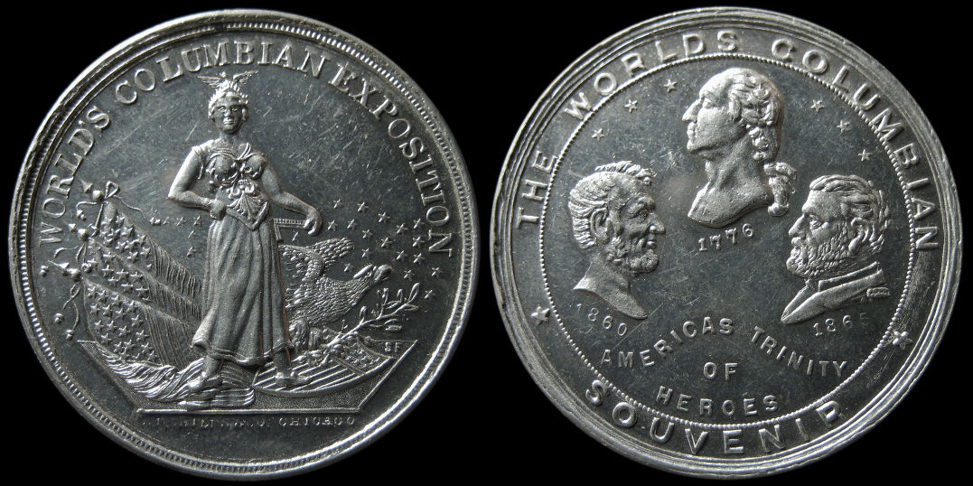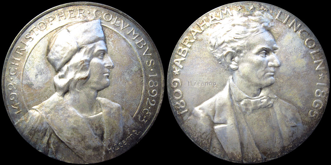 228) Columbus bust right. 1492 Christopher Columbus 1893 & 3 around. H Zearing below shoulder next to rim. Rv: Lincoln right. 1809 Abraham Lincoln 1865 around. H. Zearing to the left of portrait /// Eglit85 and described in Eglit as being made of "silver, copper, gilt and gilded". My image example here, although it definitely looks like silver with no underlying metal showing through, has in fact a specific gravity of approximately 8.9 which suggests silver plated copper, not solid silver. Same size and specific gravity as my #227(Eglit84). Very Rare in any metal. Silver Plated Copper. 45.3mm. (IMAGE)