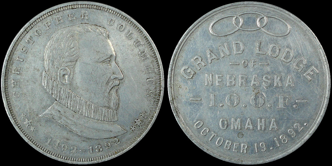 229) Bust right with ruffled high collar. Christopher Columbus around above. 1492-1892below. Rv: Three rings above. Grand Lodge Of Nebraska -O.O.O.F.- Omaha October 19. 1892. in six curved and straight lines /// Extremely Rare. Aluminum. 38mm. (IMAGE courtesy Jonathan Brecher)