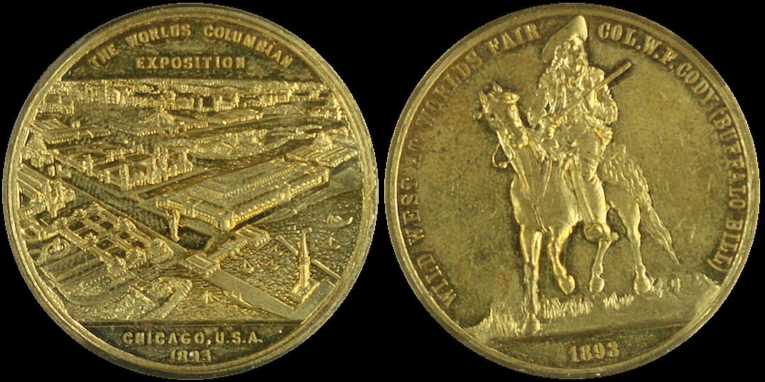 31) Three buildings on top of each other in three sections. Rv: Man on horse with rifle. Wild West At Worlds Fair Col. W.F. Cody (Buffalo Bill) around above. 1893 below in exergue. /// Extremely rare, Gilt / 38 mm / Reverse of HK167a combined with the reverse of Eglit361. Presidential Coin and Antique Co. auction #77 lot#250 with picture. SH6-170 (IMAGE)