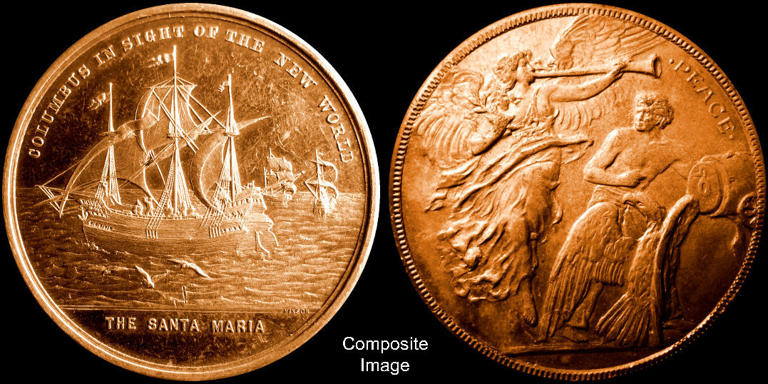 26) Sailing ship with two smaller ships to the right. Columbus In Sight Of The New World around above. The Santa Maria below. Hanson in microscopic lettering at bottom left base of sea scene. Rv: Winged female figure with horn. Male figure leaning on cannon with eagle on ground before him. Peace around upper right. /// Extremely rare, Bronze / 38 mm / A combination of two mismatched dies made by Hanson of Chicago - the reverse of HK167 combined with a Peace design used on 1898 peace jubilee pieces. Sold on ebay in 2007 (IMAGE)