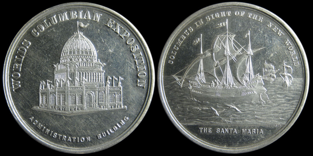 27) Sailing ship with two smaller ships to the right. Columbus In Sight Of The New World around above. The Santa Maria below. Hanson in microscopic lettering at bottom left base of sea scene. Rv: Corner view of building with central dome. Worlds Columbian Exposition around above. Administration Building around below. /// Extremely rare, Aluminum / 37.9 mm / The obverse of HK210a(Eglit546) combined with the reverse of HK167 and HK204. SH6-149 (IMAGE)